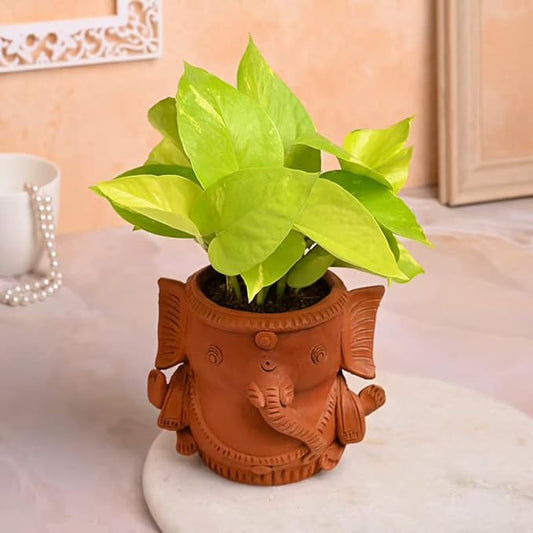 FlowerAura Decorative AirPurifying Money Live Indoor Plant With Clay Terracotta Ganesha Shape Pot Vase For Living Room, Balcony, Table Desk, Office/Home Decoration