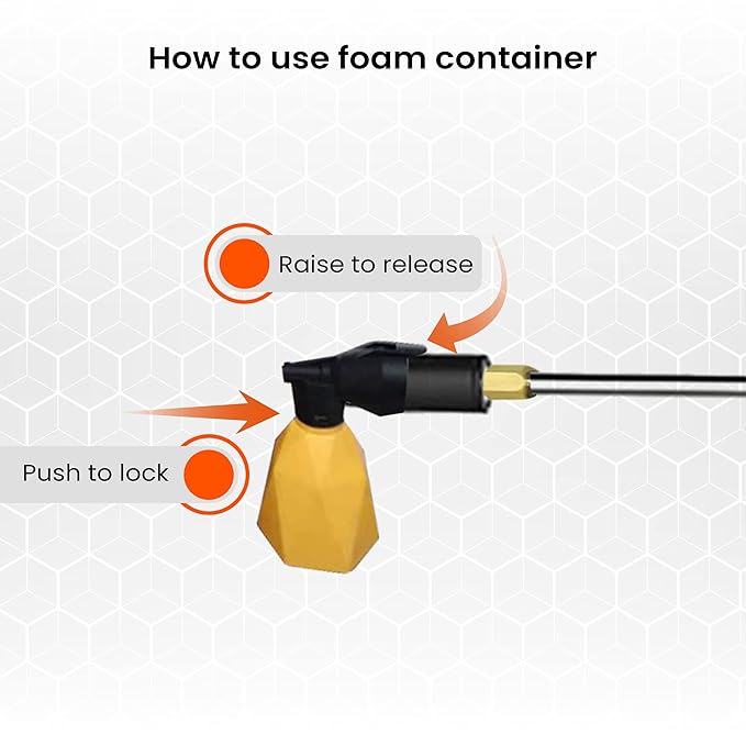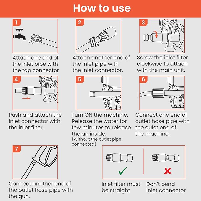 - Includes 3 meters inlet pipe, 8 meters outlet hose, spray gun extension rod,1 inlet filter, 1 inlet connector,1 tap connector, 1 bucket water filter, foam spray bottle