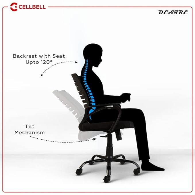 - ★ Ergonomic Sitting Position : CELLBELL Desire Chair is designed to give you ultimate comfort by providing you fully adjustable chair which has Ergonomic Nylon back support, with breathable mesh to keep you sweat free, adjustable height, Smart Tilting Mechanism with locking feature and Smooth 360 degree Swivel.