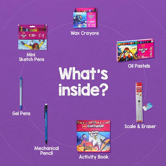 - The Cello ColourUp Celebration Kit - Gift Pack contains an assortment of 12 Wax Crayons Colours Set, 12 Oil pastels, 1 Colour Bomb Pen, 1 Ruler, 1 Eraser, 1 Smarty Mechanical Pencil , 1 Activity Book, and 15 Mini Sketch Pens.